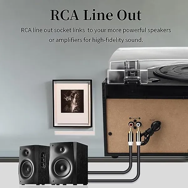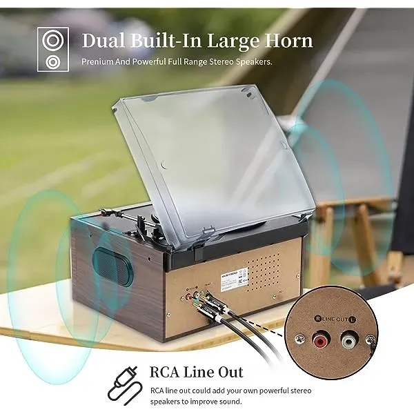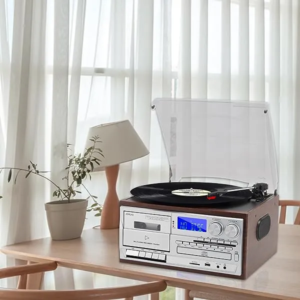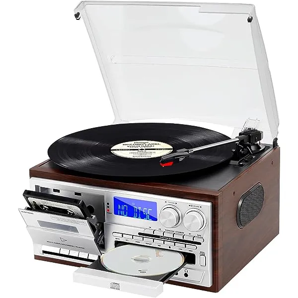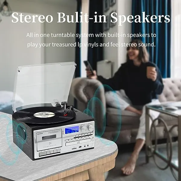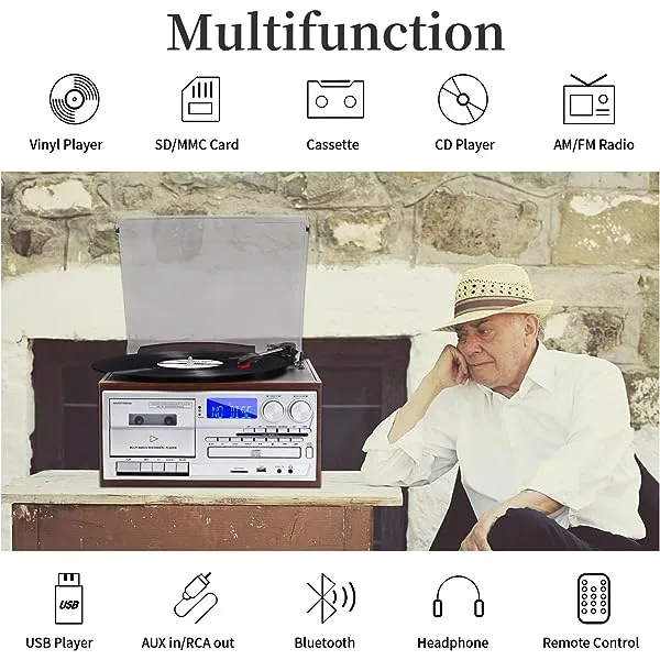 - Multifunction --- The vinyl player is not only a high quality vintage piece of furniture, but also a multifunctional player. CD and cassette player, built-in wireless music playback from your activated device with Bluetooth, PLL, FM / AM digital radio, USB / SD playback and encoding, 3.5mm Aux-In jack for playing music from devices and headphone jack and LINE OUT connector for external speakers.