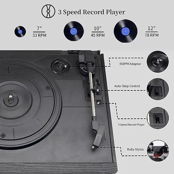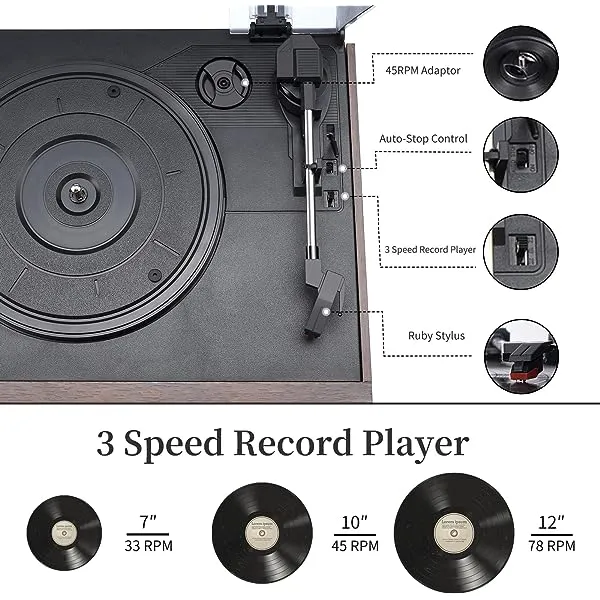 - 3-Speed Choose --- Three-speed Turntable (33, 45, 78 RPM) plays all of your 7" 10" 12" vinyl records with a 45 rpm adapter. Play your vinyl and choose the right speed. There is an "AUTO STOP" switch, set it to "ON", vinyl playback will not stop unless you stop it manually. Set it to "OFF", vinyl playback stops automatically, but it may not be the last music on your vinyl.