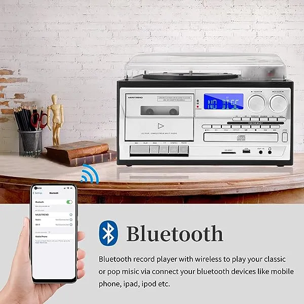 - Bluetooth Connection --- Transmits music wirelessly up to 10 meters. It's easy enough to enjoy music from your mobile devices. You can record vinyl to USB or SD, record cassettes and do not need a computer or software.
